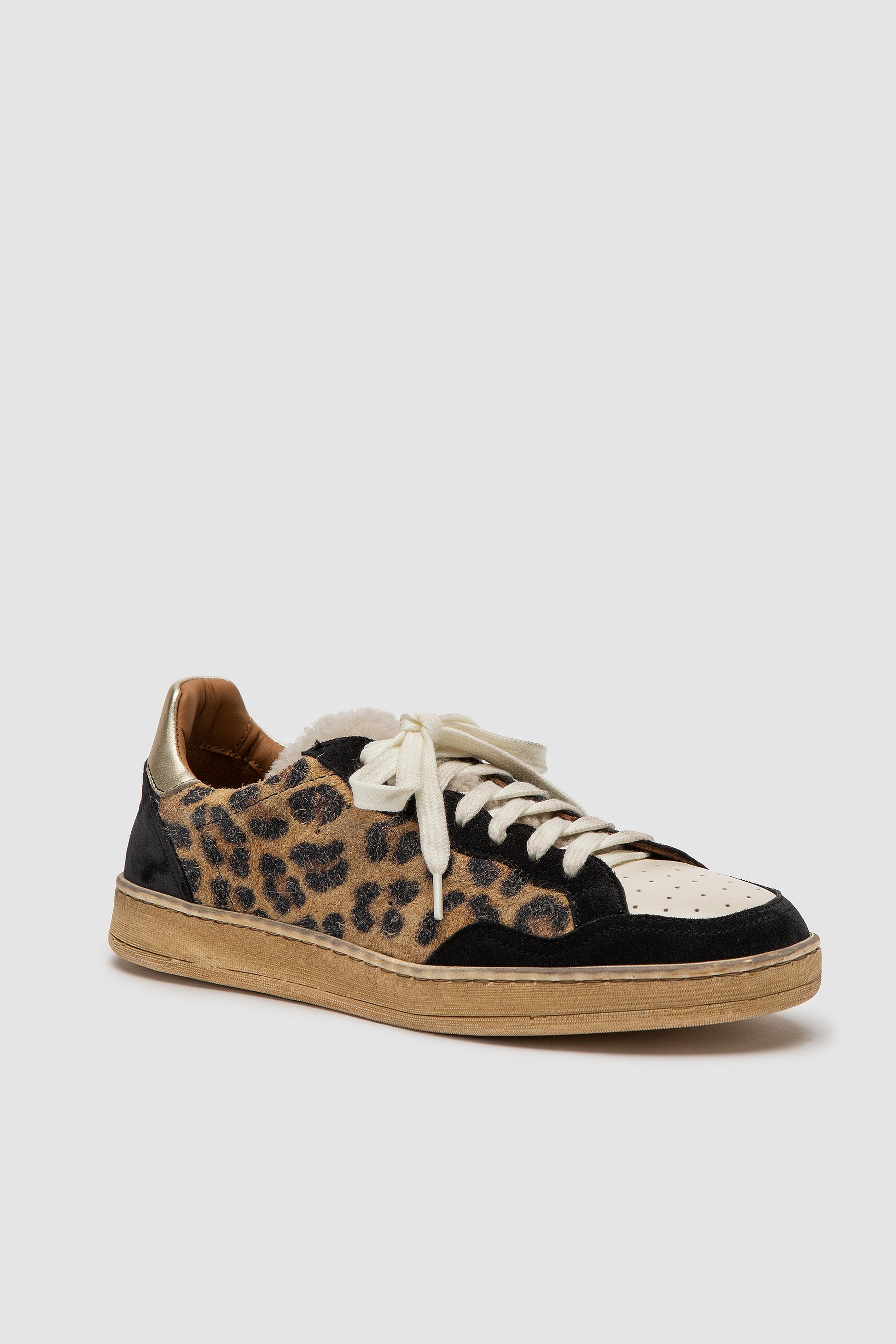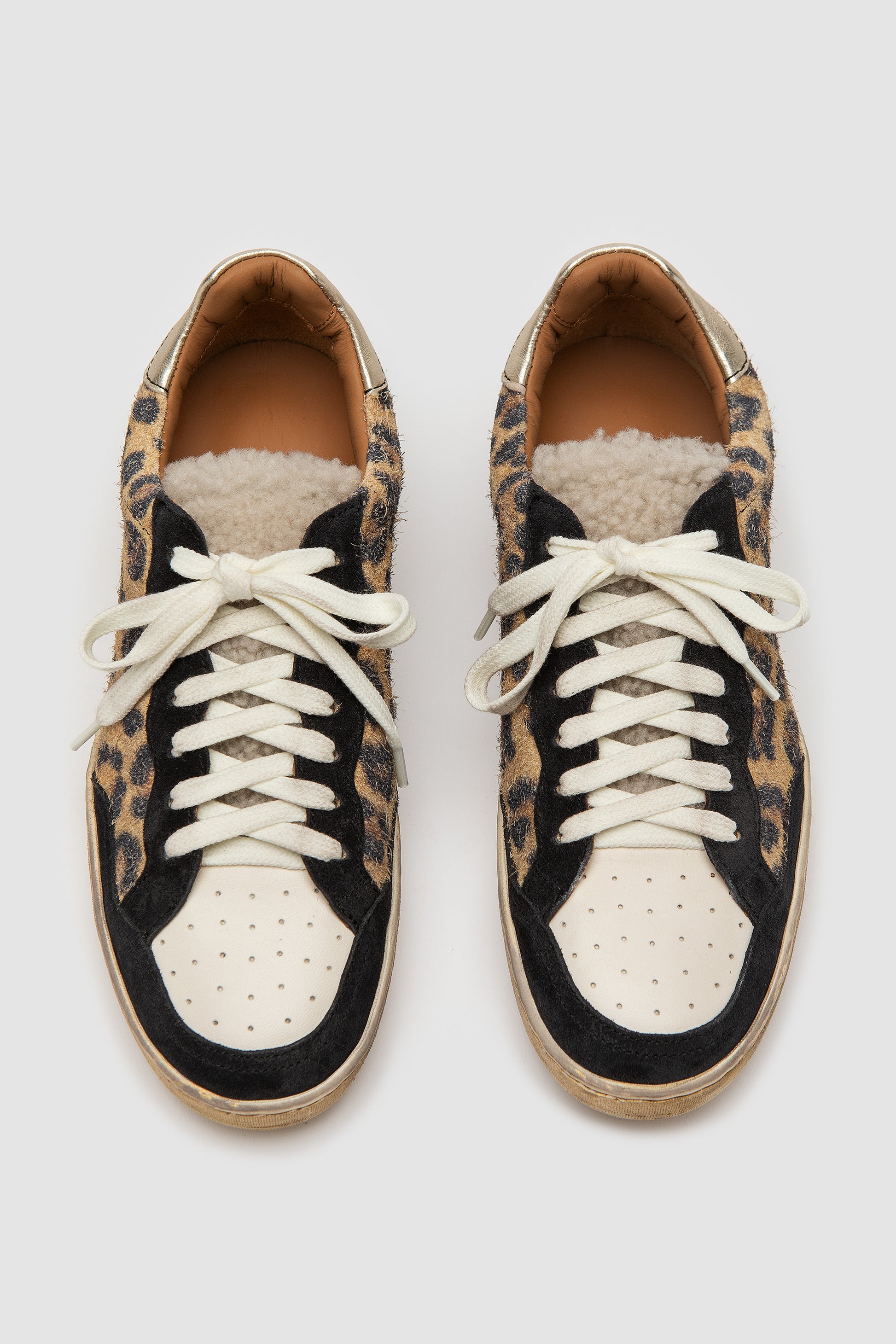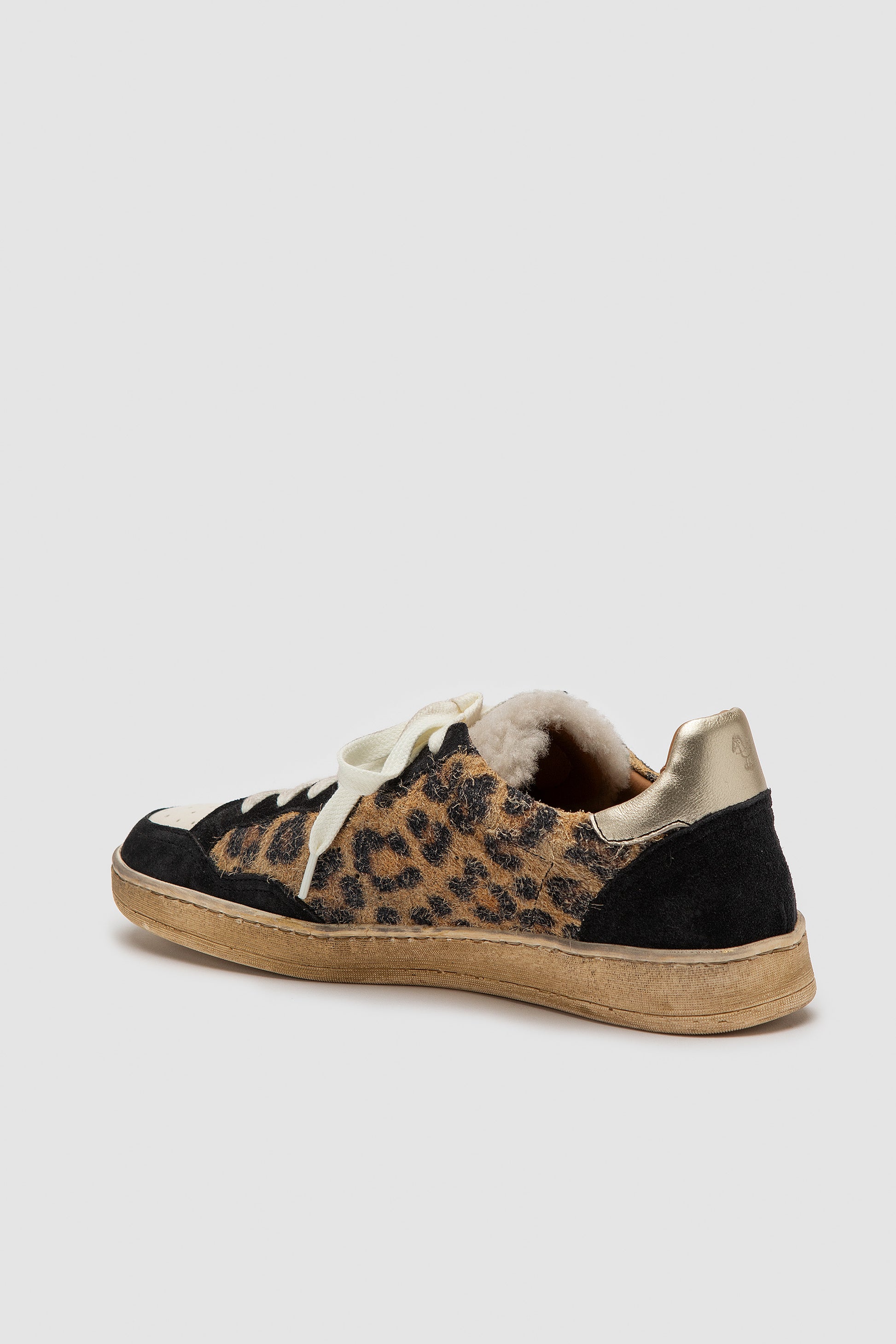 Baskets confectionnées à partir d'une combinaison de trois types de cuir : nappa très doux, daim imprimé léopard et accents nappa métallisés. La languette et la semelle sont en laine de mouton. Extrêmement flexible grâce à la construction Strobel, avec une doublure en nappa sans chrome et une semelle en lait de caoutchouc 100 % naturel. Dotées d'une semelle en latex avec aloès, recouvertes de cuir de veau perforé pour une meilleure respirabilité.