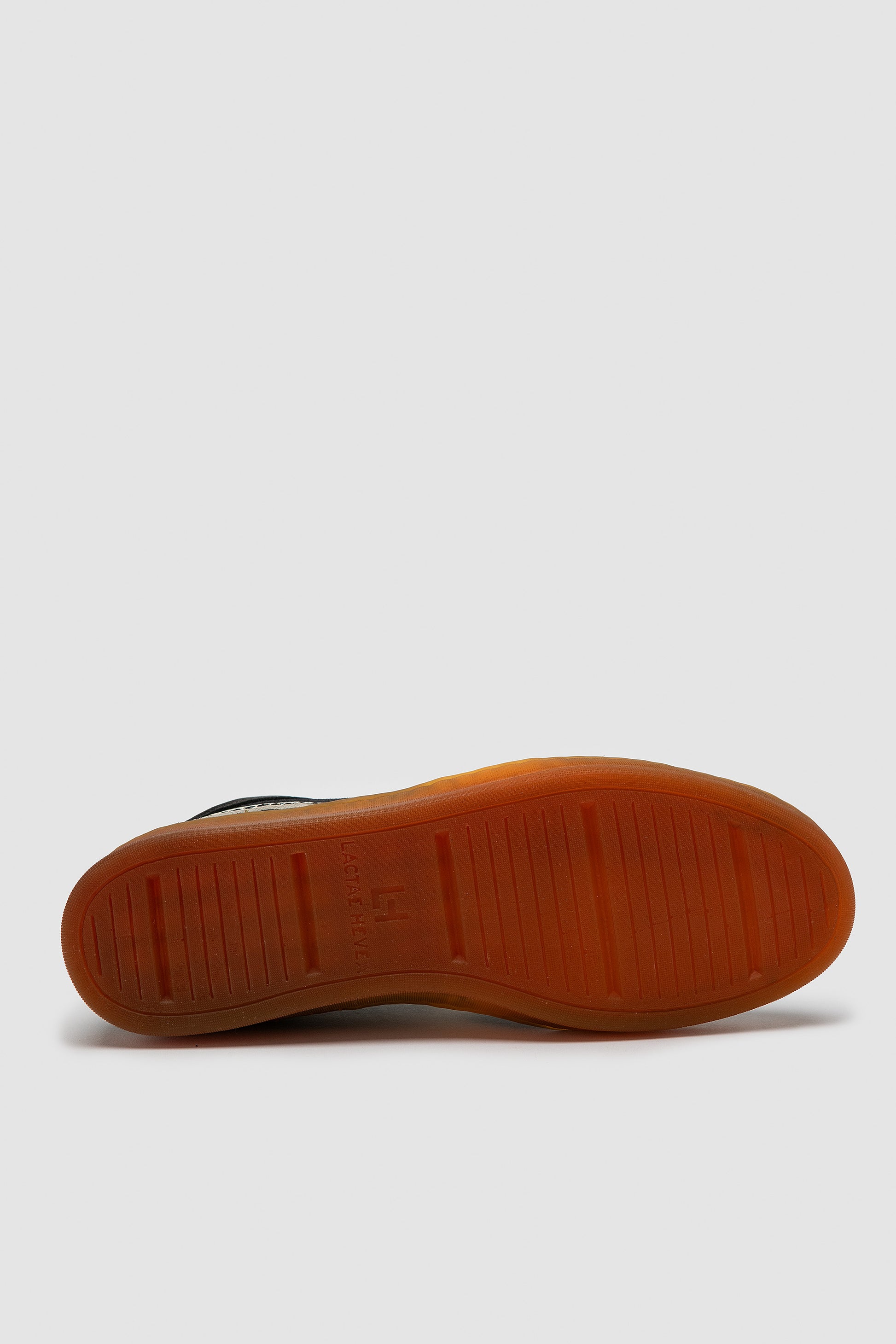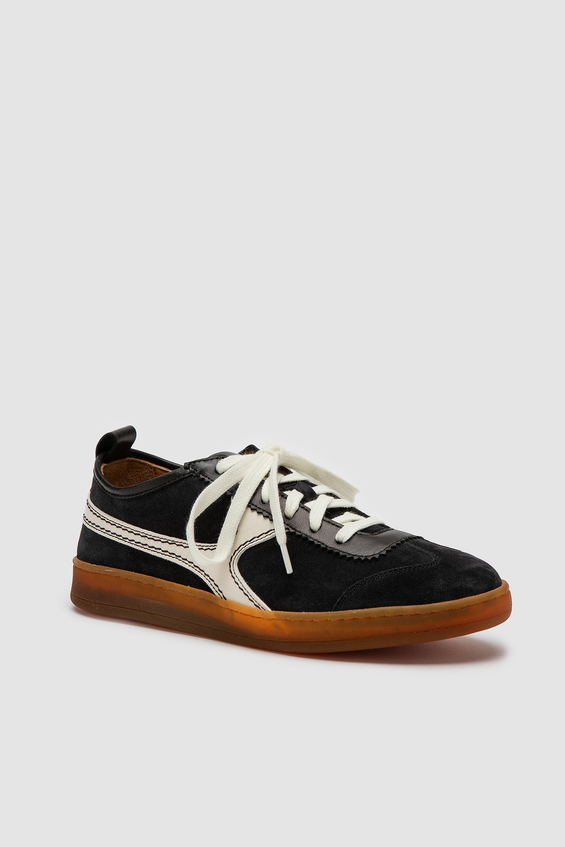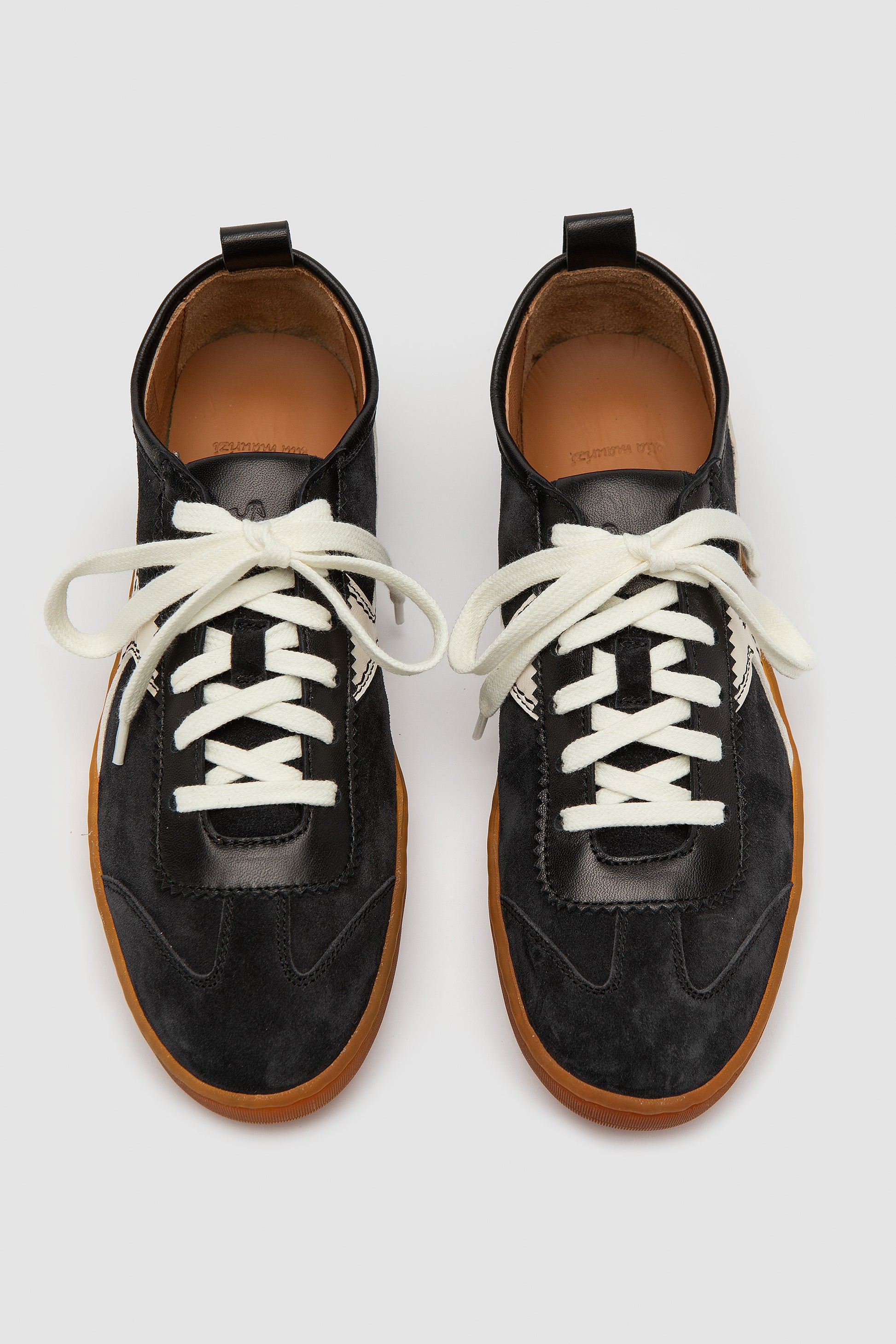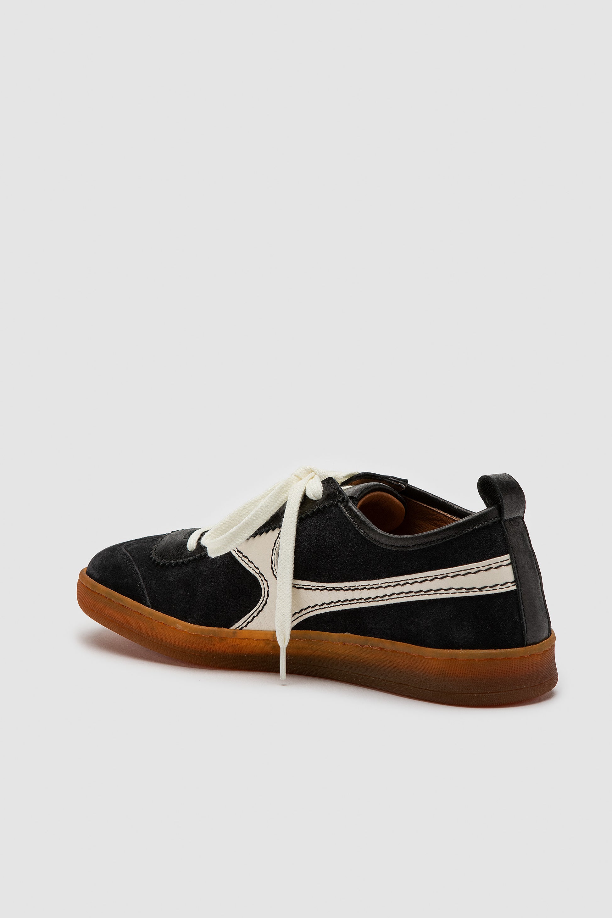 Sneaker in pelle e suede nera, realizzata a mano con fodera interna in vitello pregiato e morbida nappa di capra.