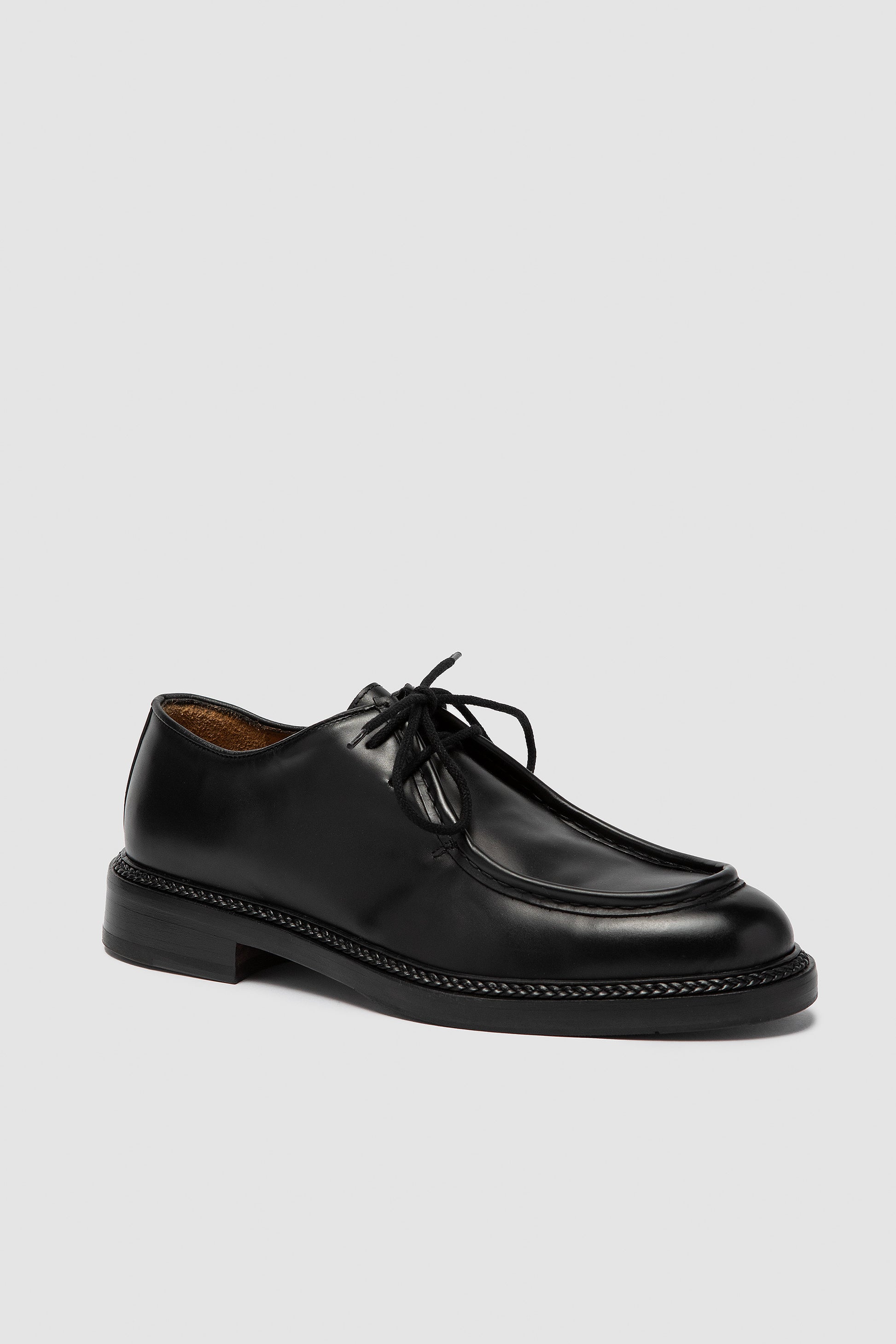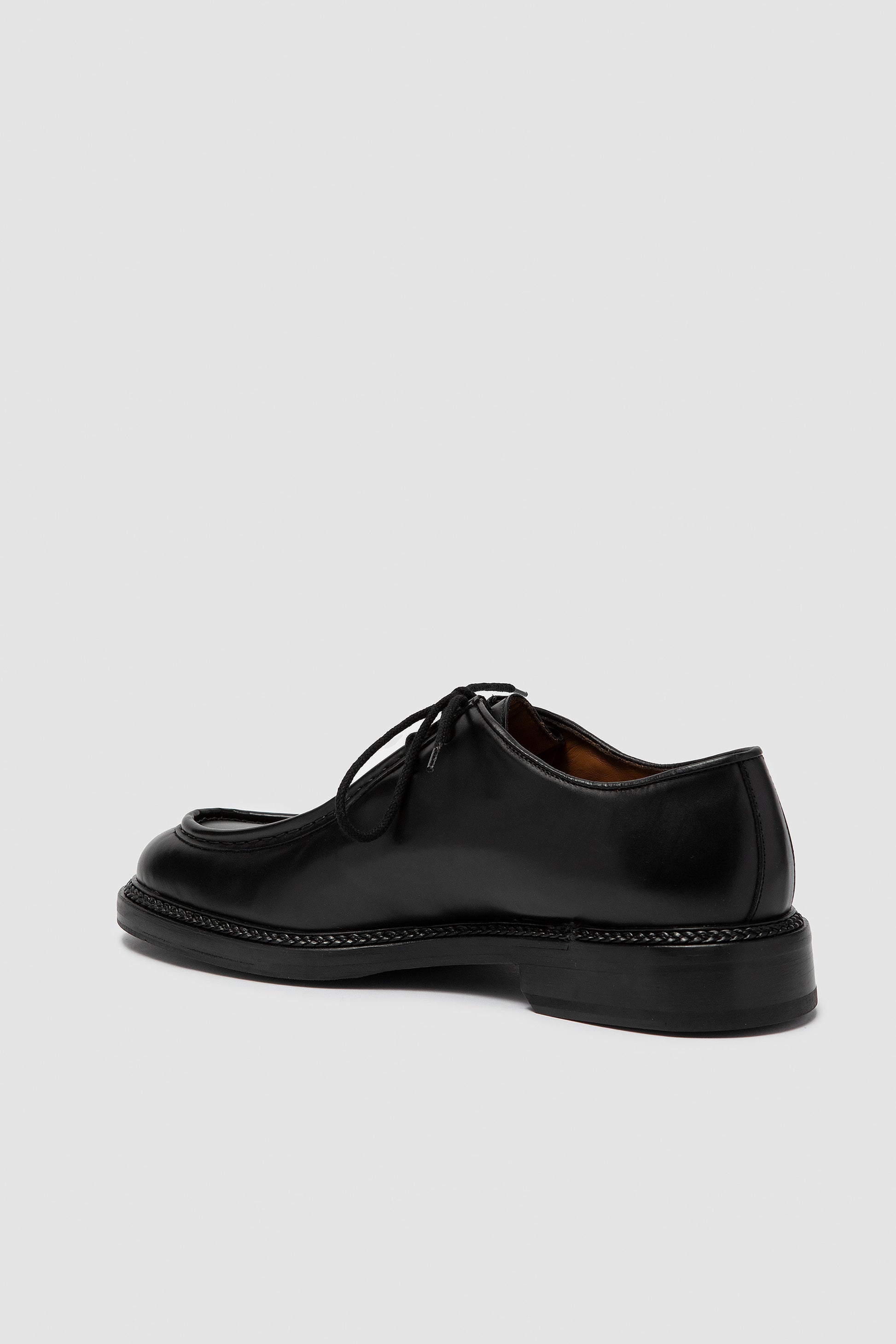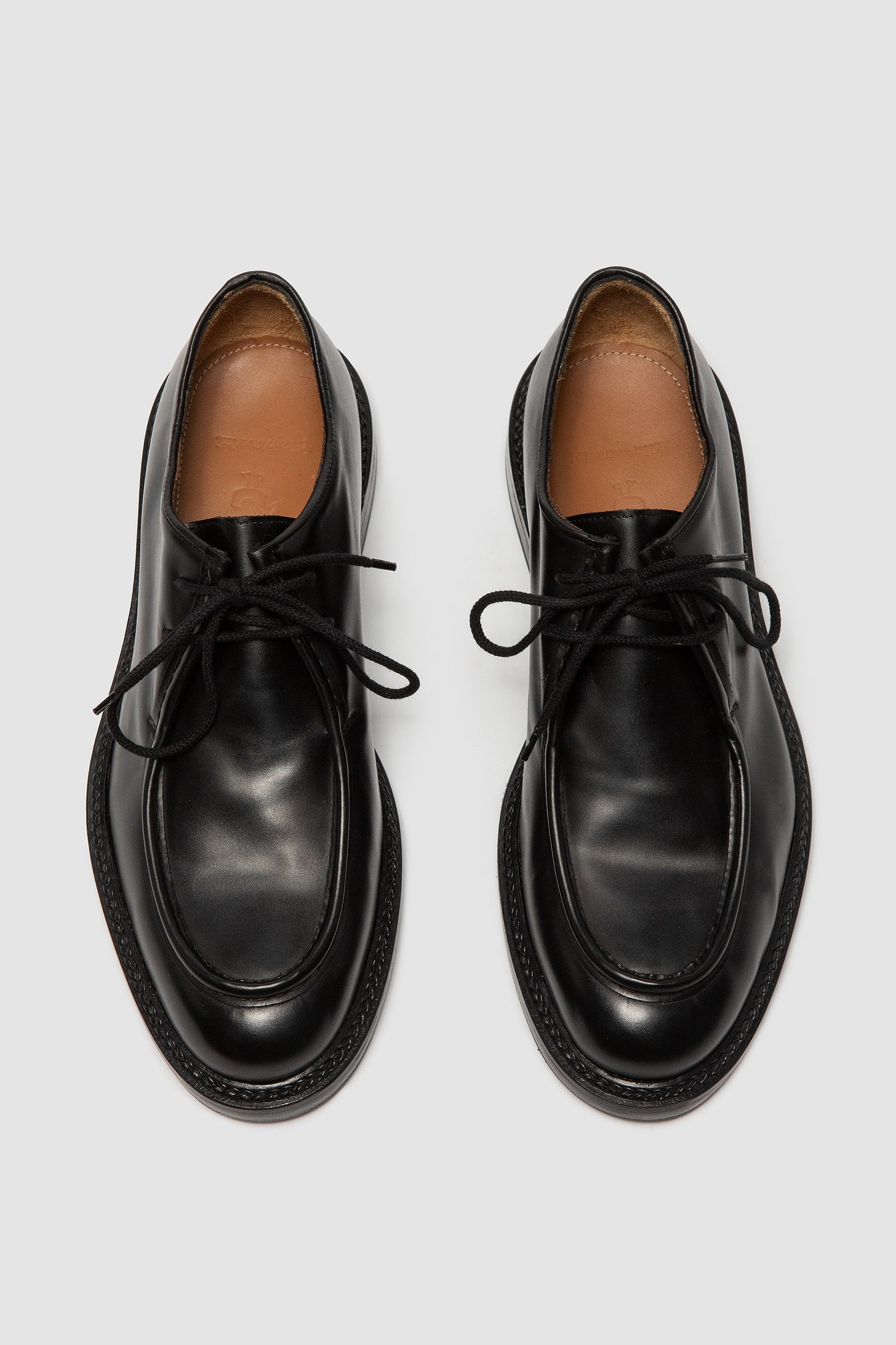 Scarpa Wallaby con lacci, realizzata a mano in pelle di vitello con fodera interna in nappa e suola in cuoio.
