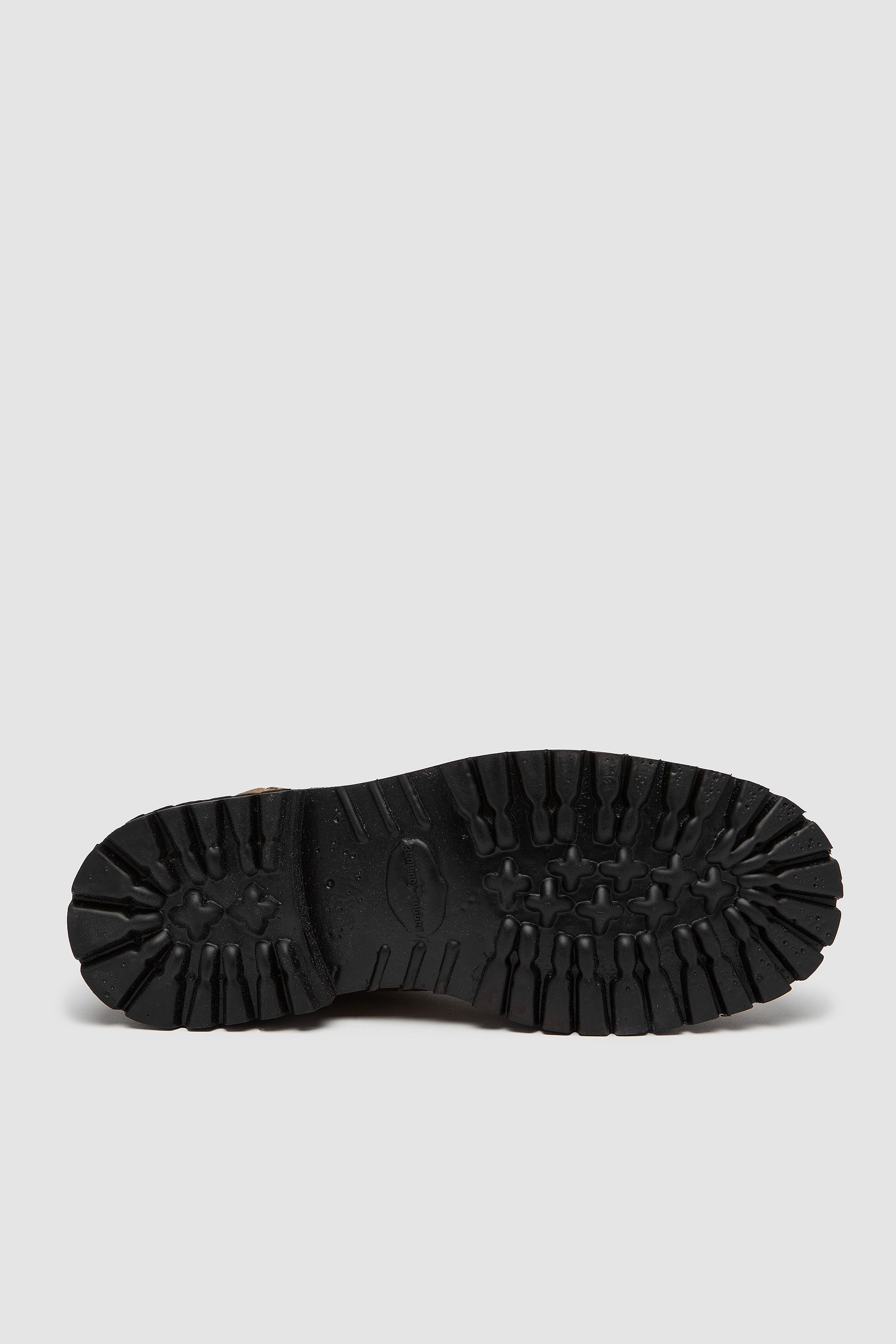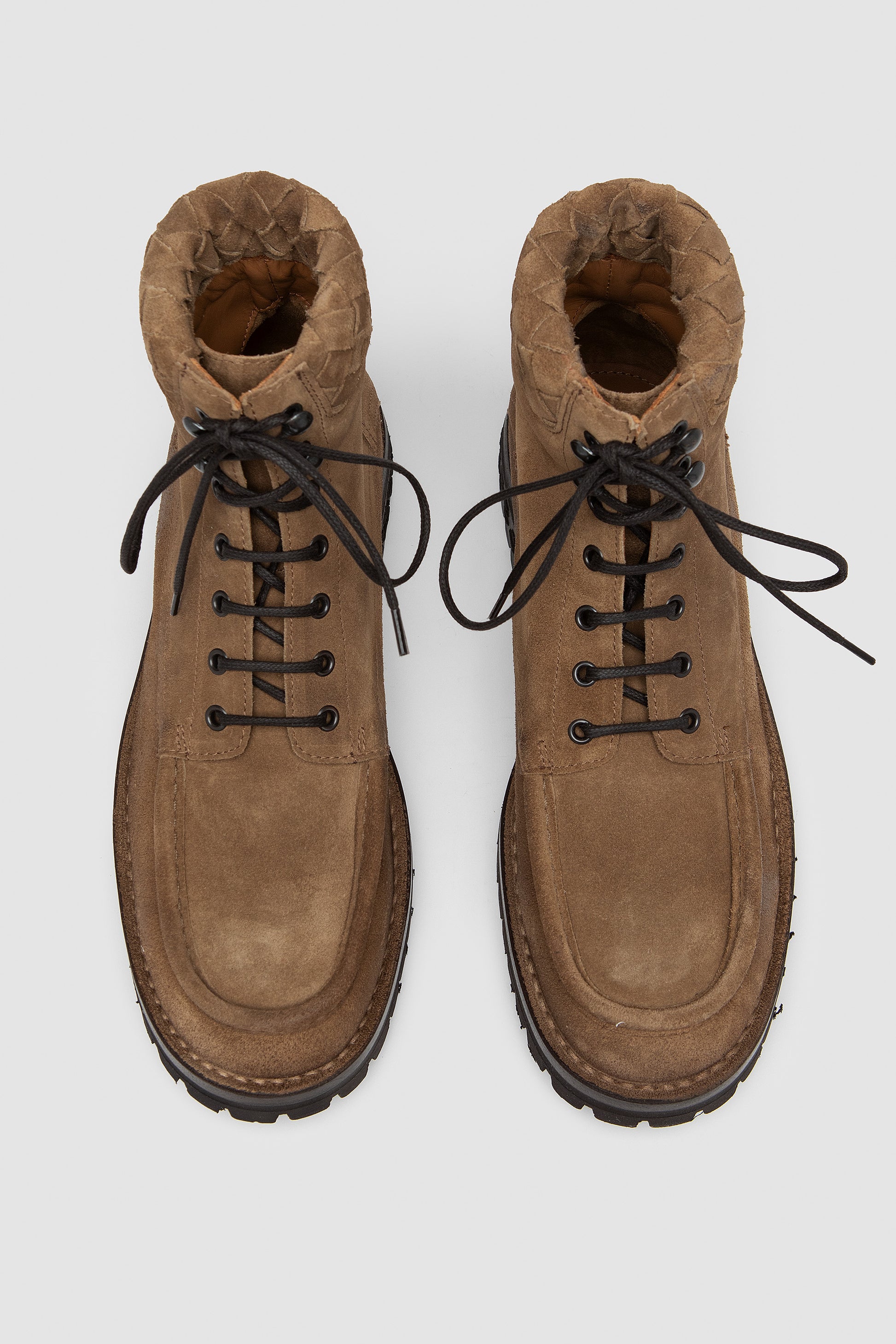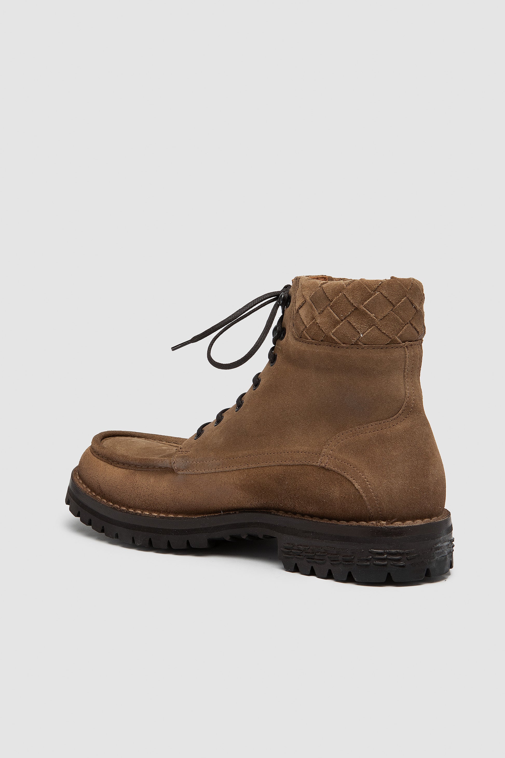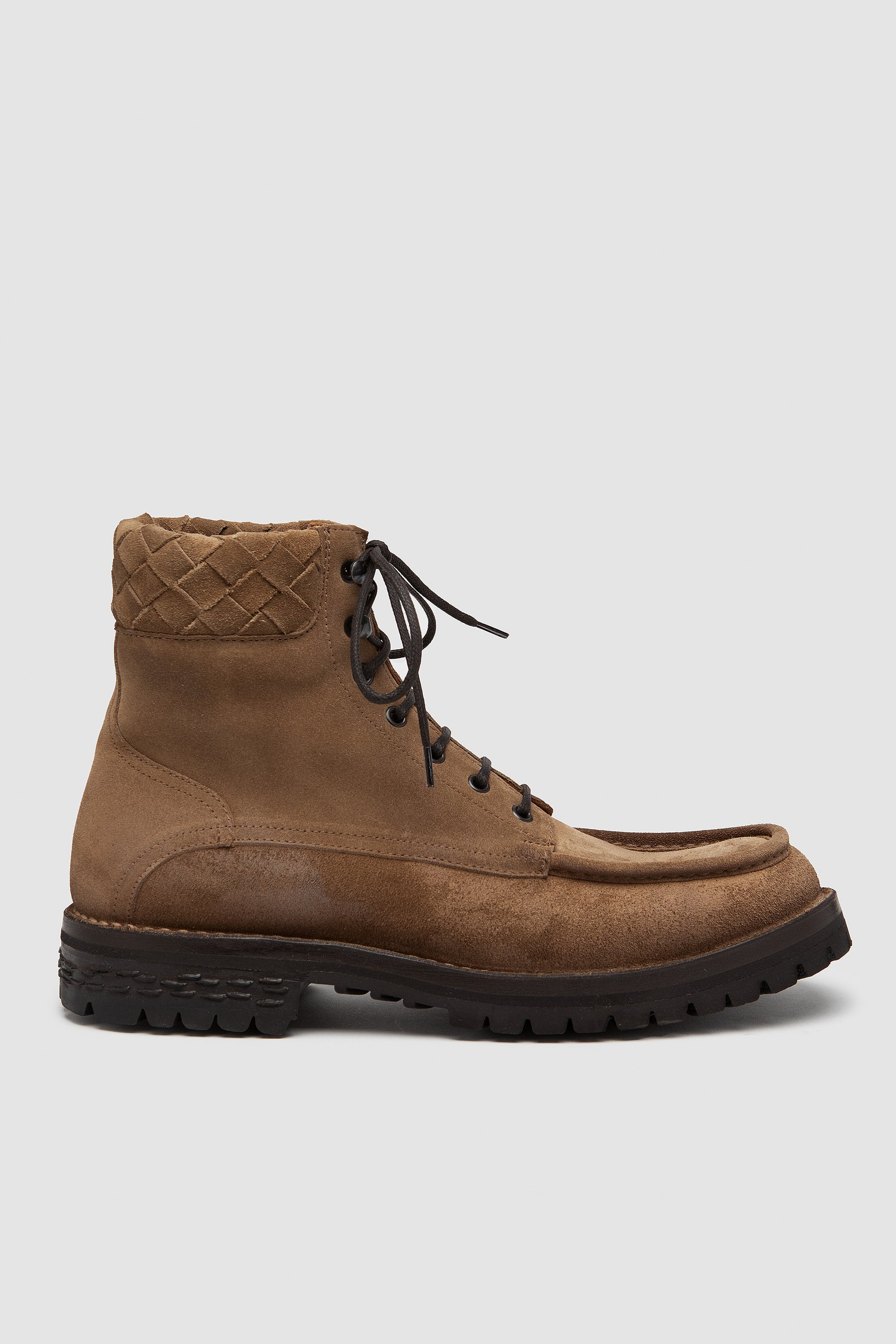 Ankle boot in soft suede calf leather, featuring a cross-pattern ankle motif. The inner nappa lining pairs with a leather insole for an enveloping comfort. A rugged rubber tread sole ensures flexibility and steady grip on the ground.