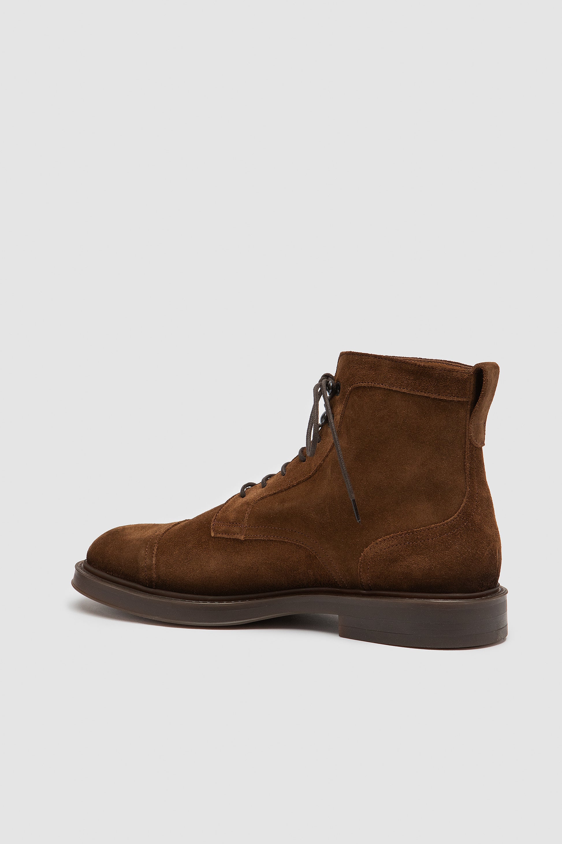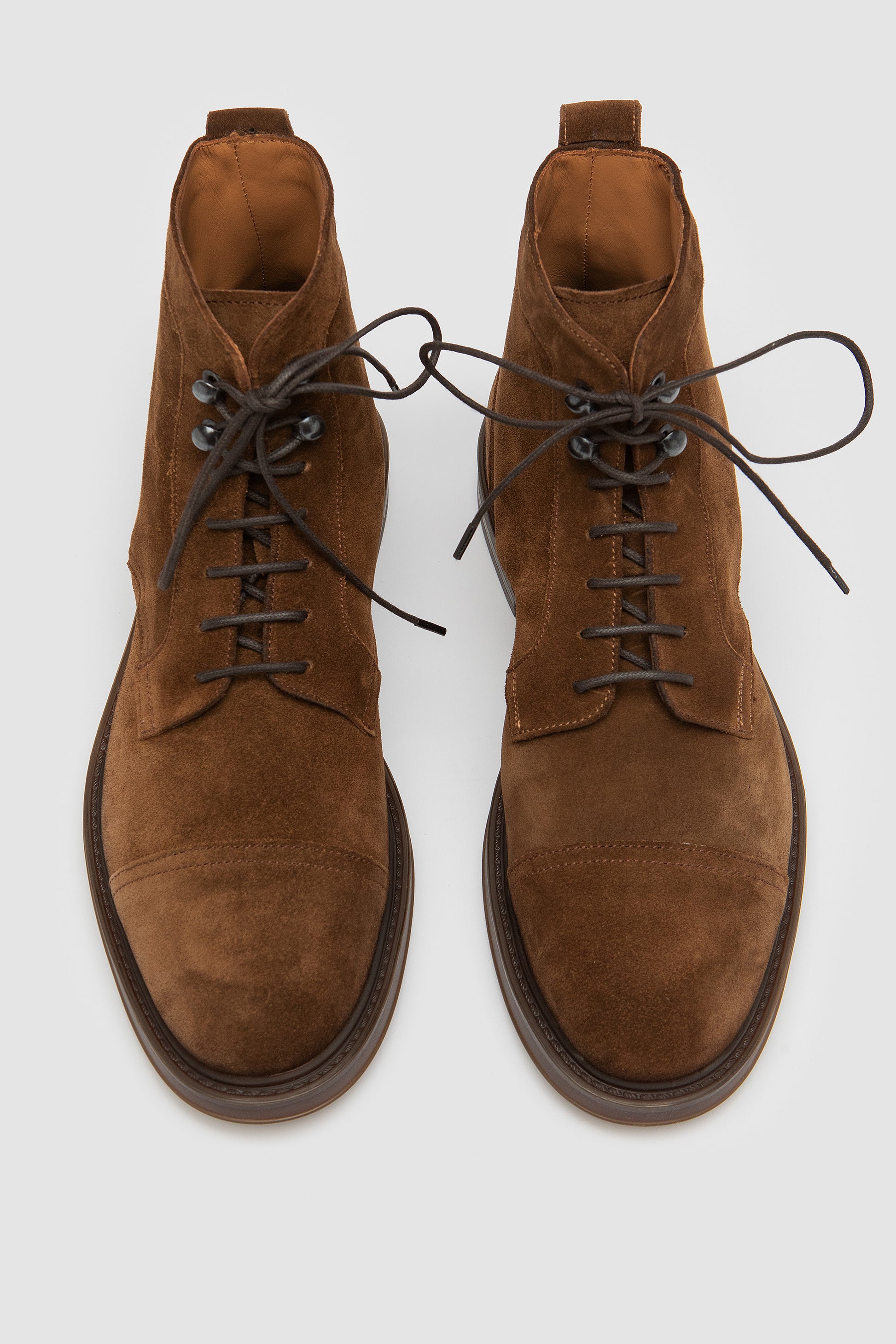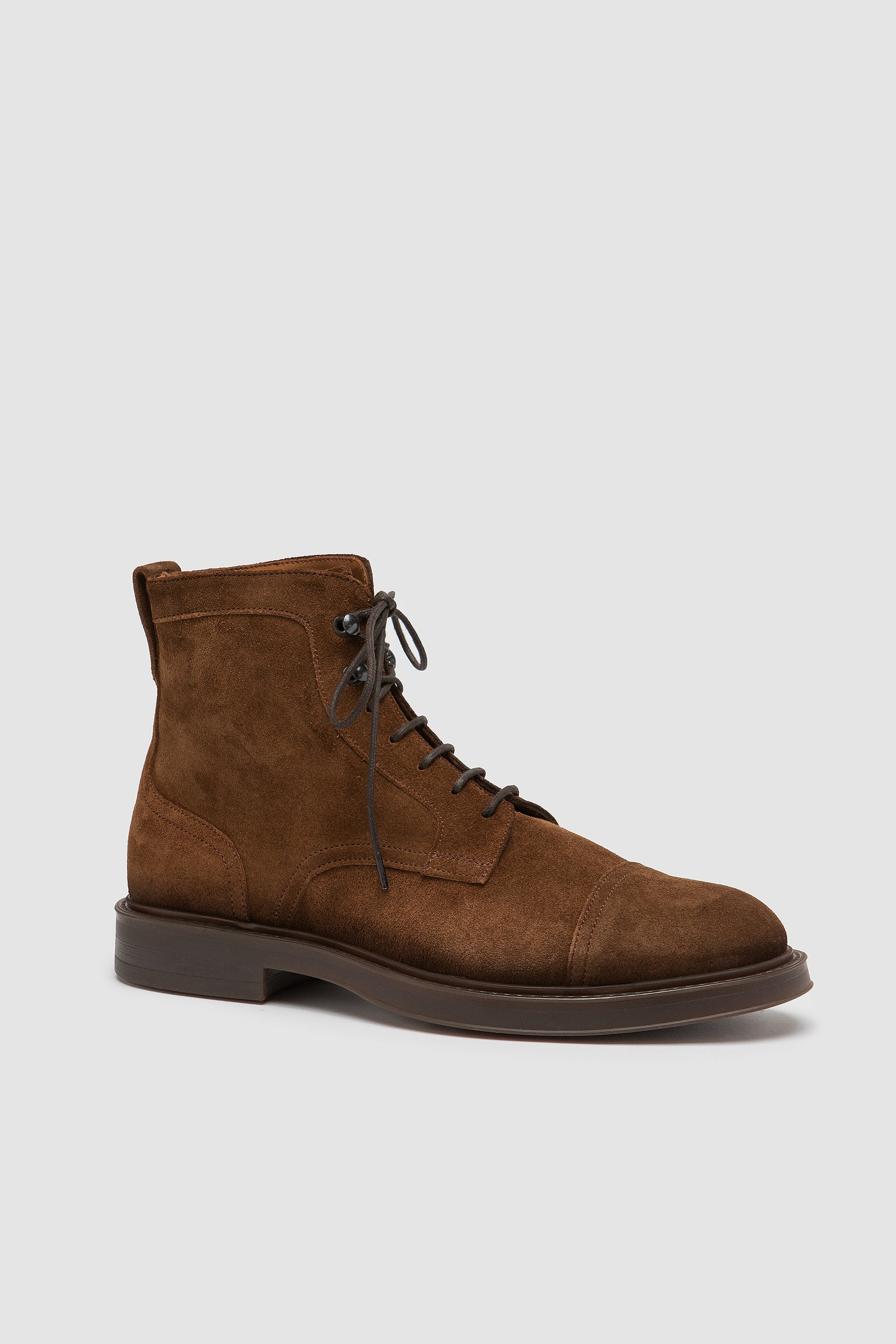 Ankle boot in soft suede calf leather, with ankle laces threaded through hinged metal eyelets. The inner nappa lining pairs with a leather insole for enveloping comfort. A rubber sole combines flexibility with protective grip.