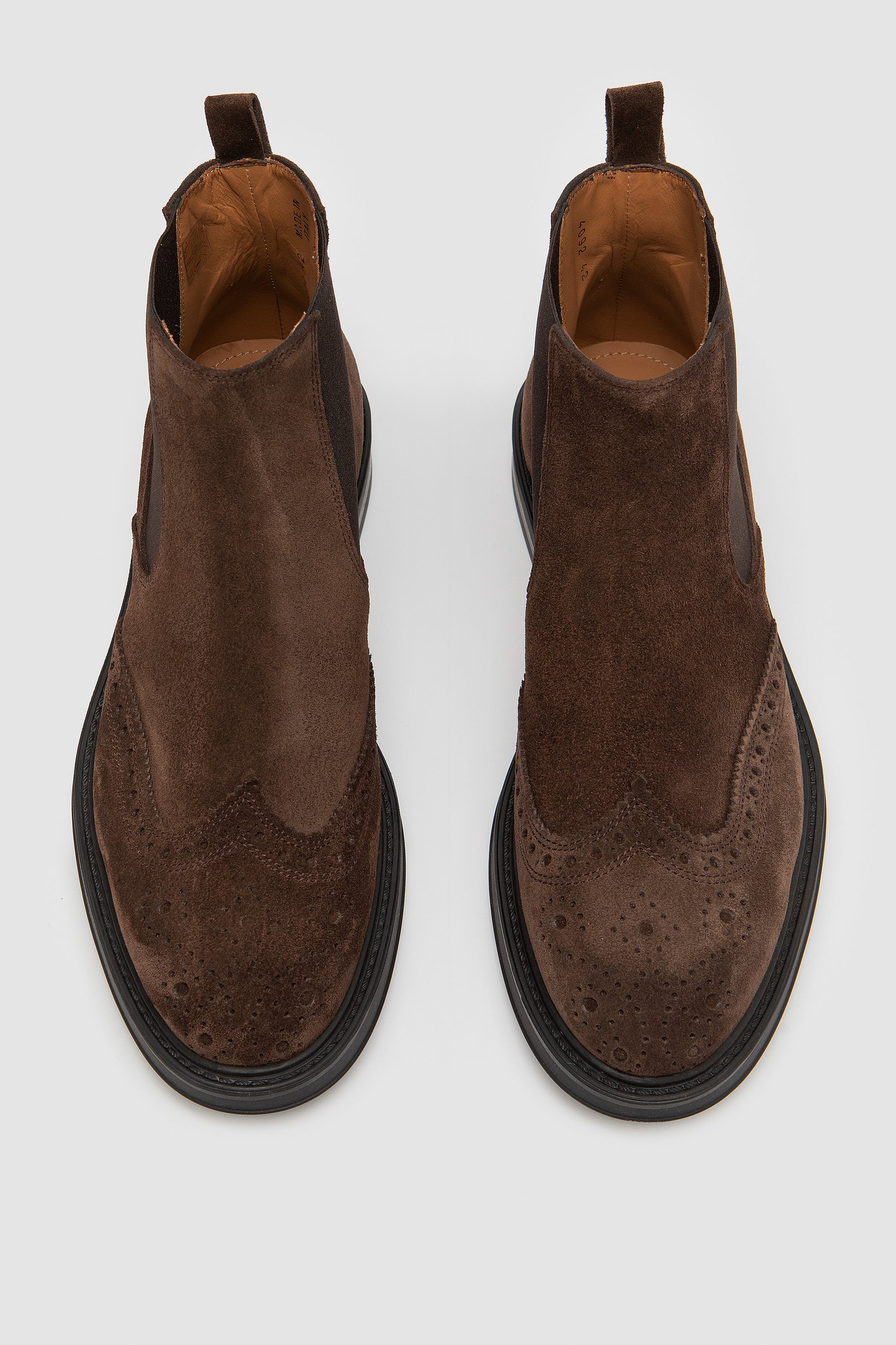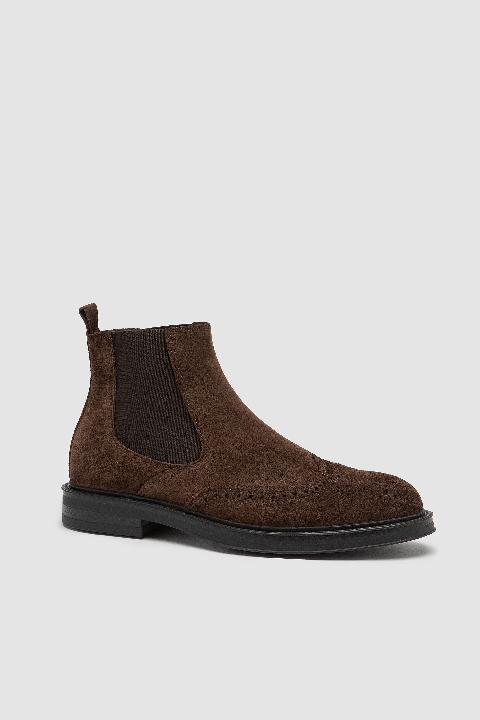 Chelsea boot in brown suede calf leather, enriched with subtle perforated detailing. The inner nappa lining pairs with a leather and rubber sole to offer a firm yet lightweight comfort.