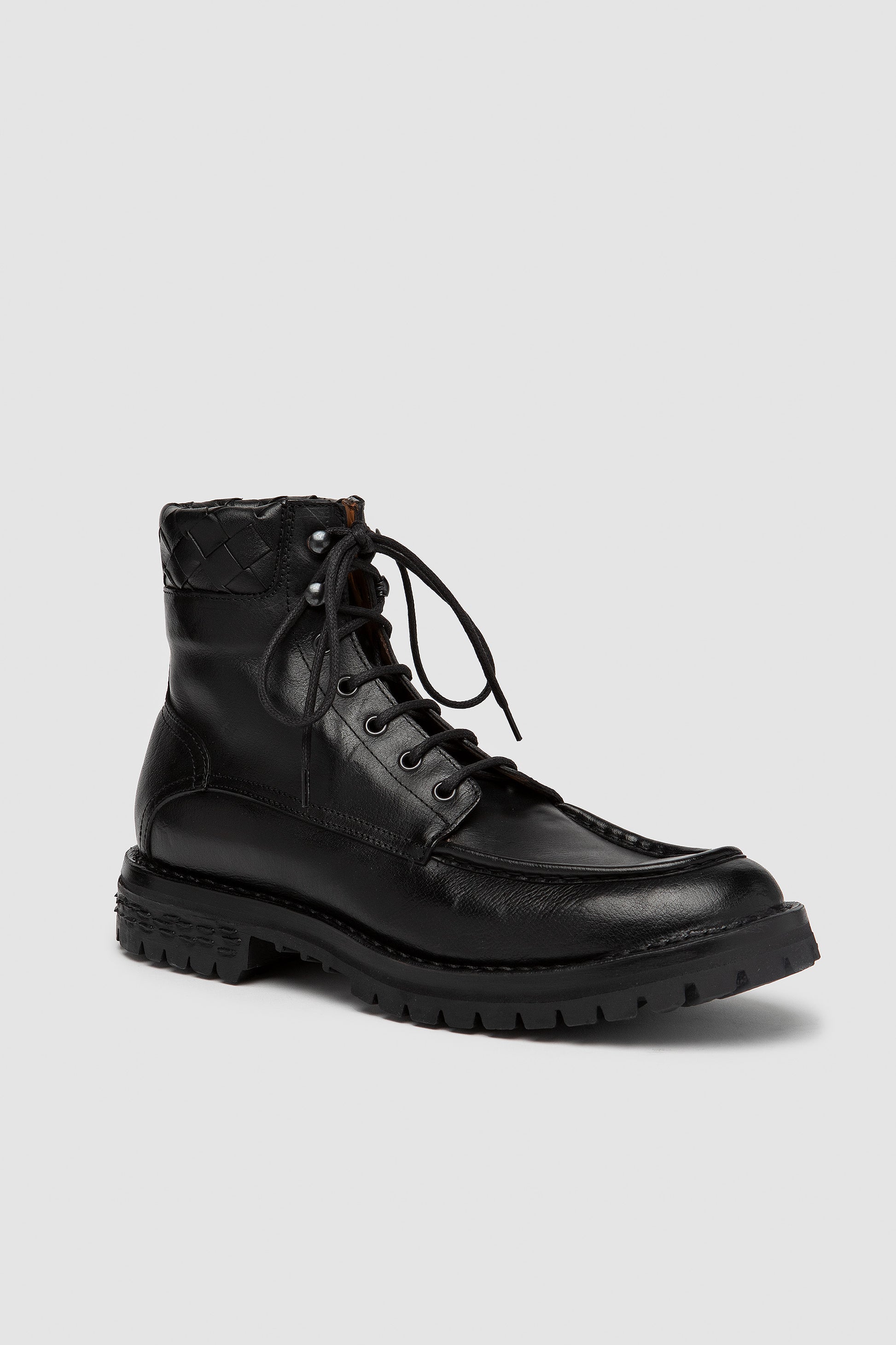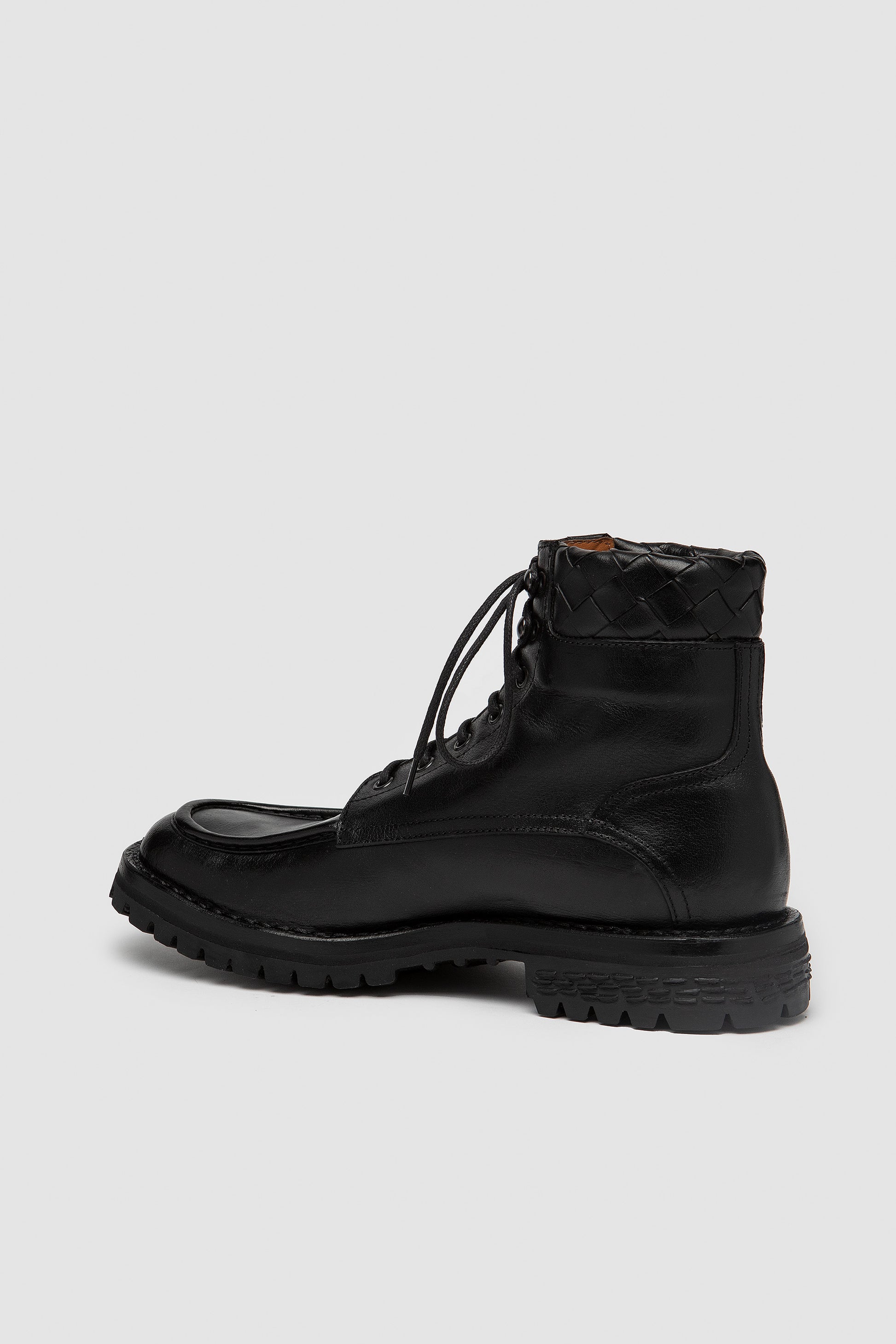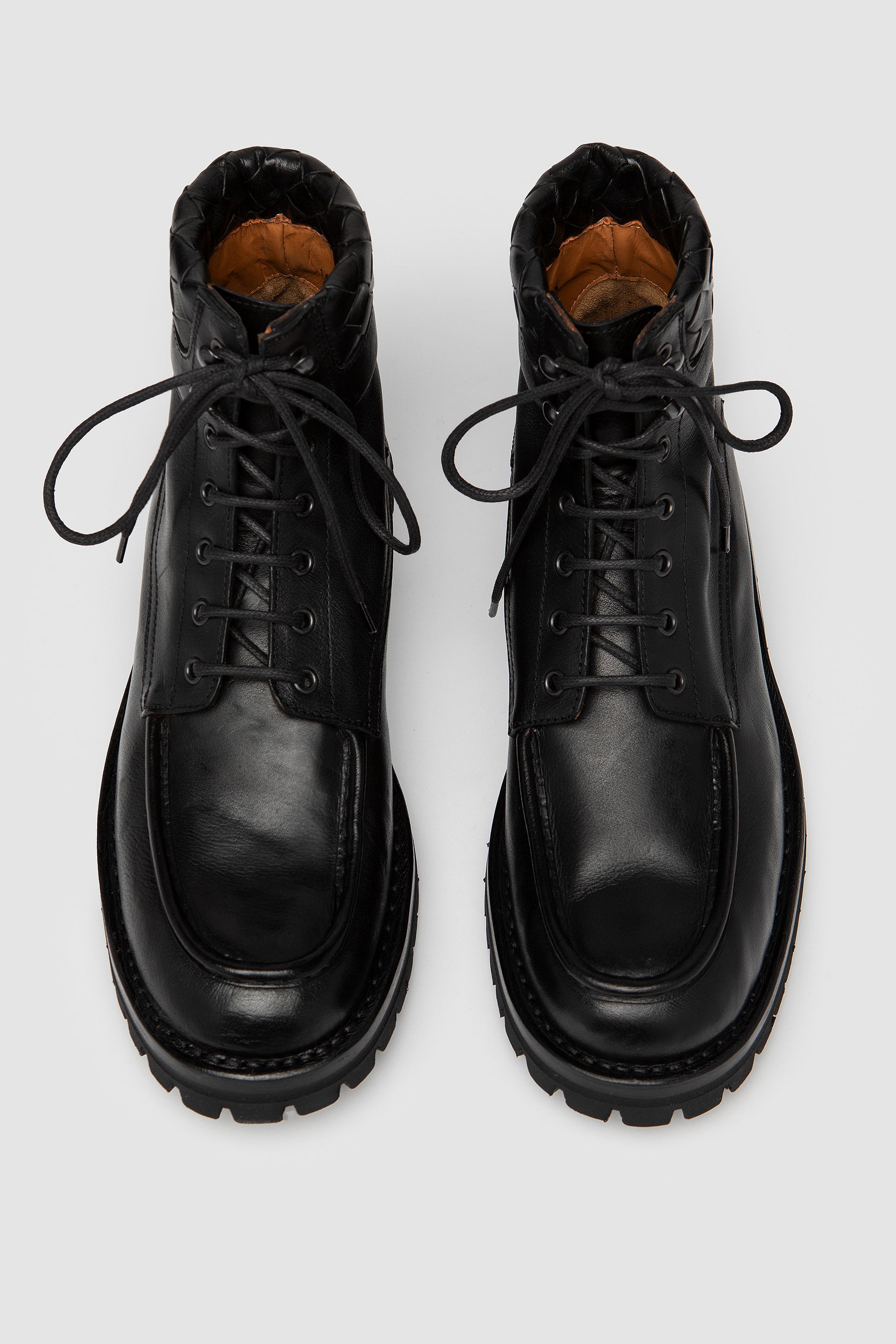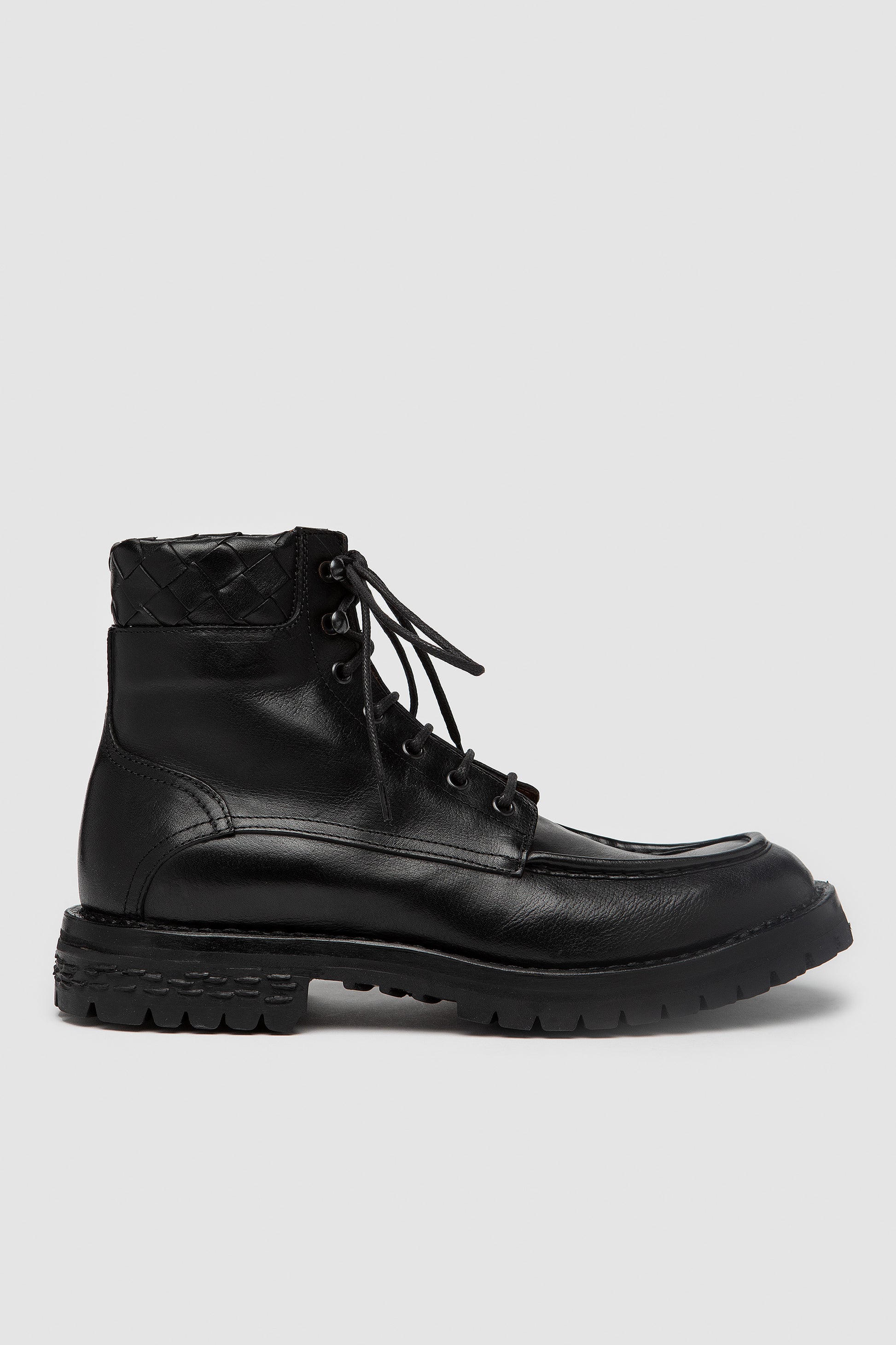Ankle boot in calf leather, featuring a cross-pattern ankle motif. The inner nappa lining pairs with a leather insole for an enveloping comfort. A rugged rubber tread sole ensures flexibility and steady grip on the ground.