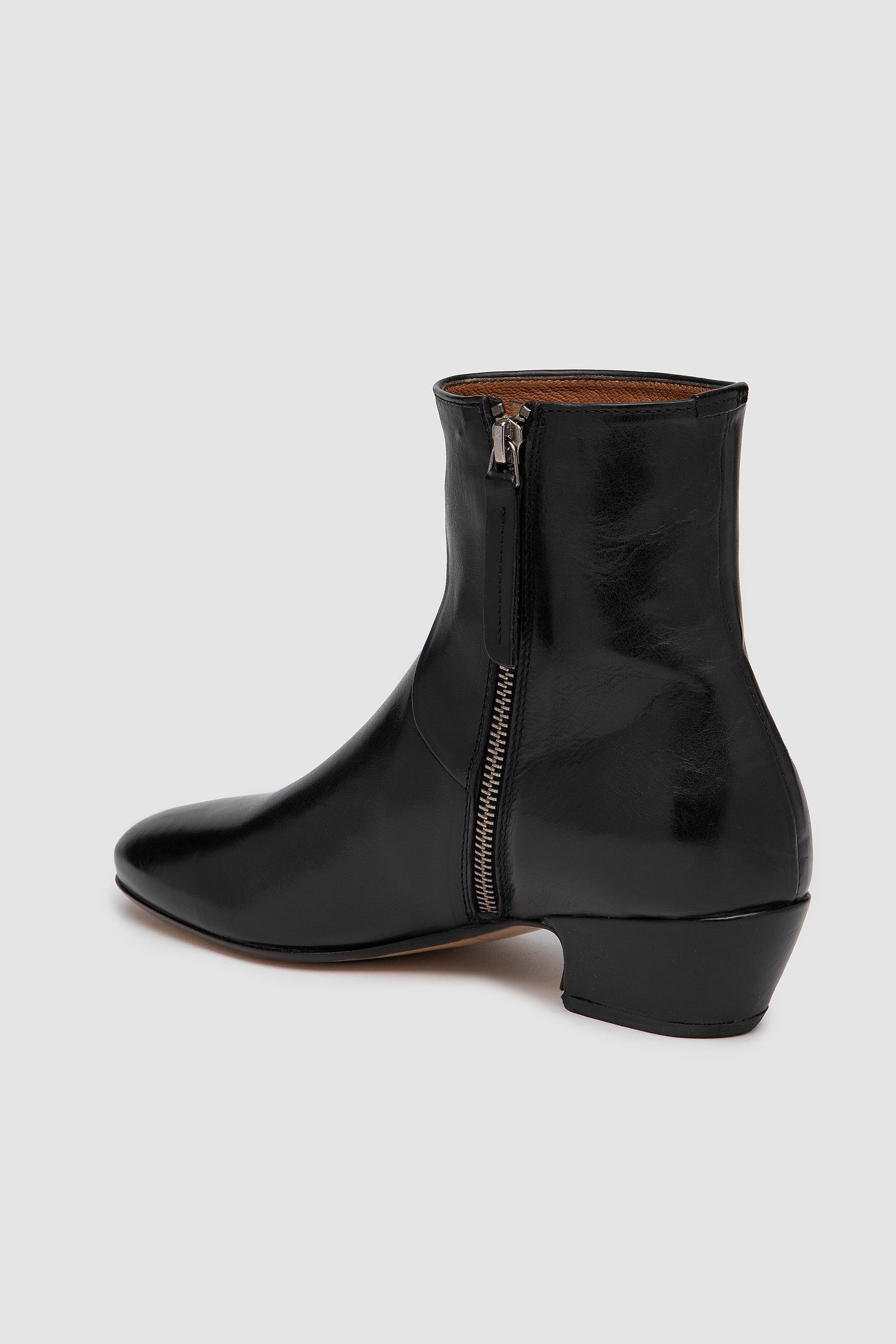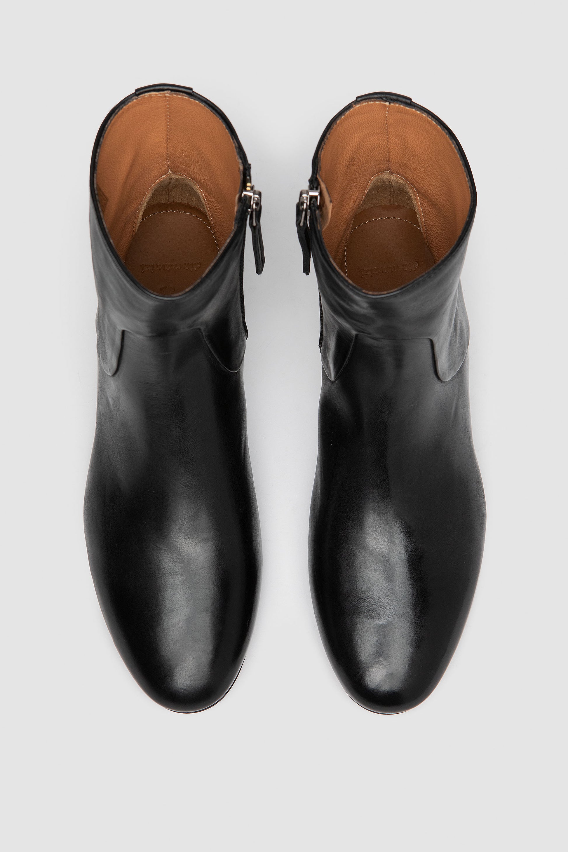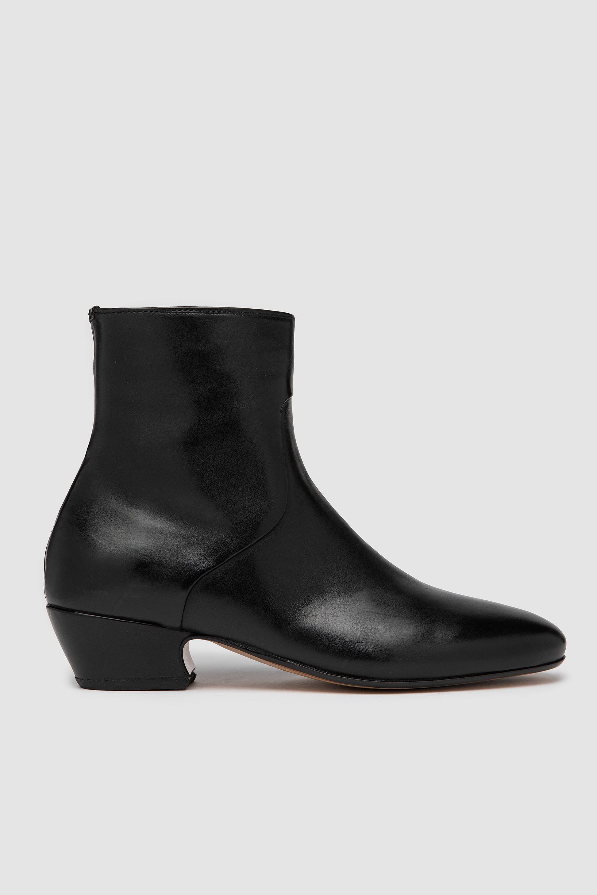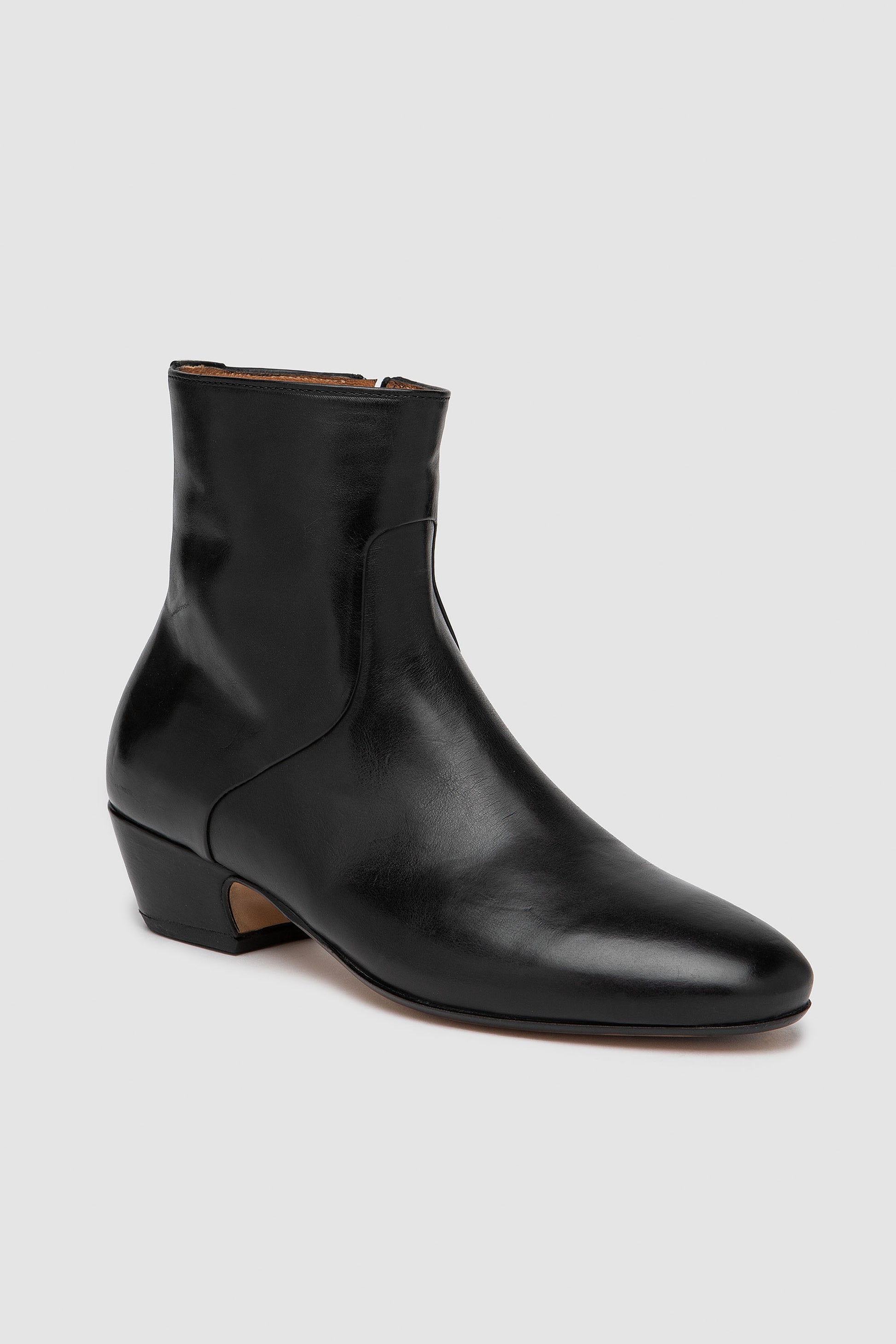 Black ankle boot with internal side zip closure, handmade from vegetable-tanned full-grain leather with nappa inner lining. Finished with a leather sole stitched to the upper for durability and refined craftsmanship.